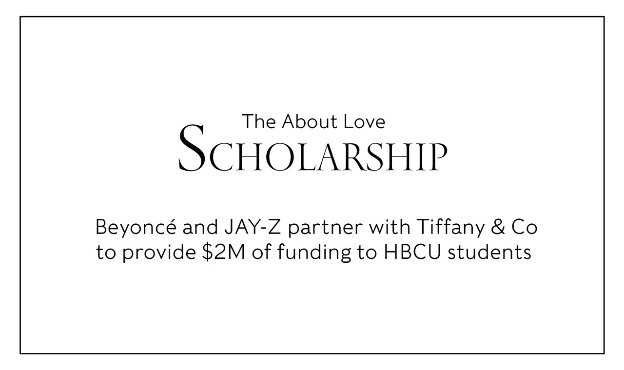 Following the launch of the ABOUT LOVE campaign starring The Carters, Tiffany & Co. announced the Tiffany & Co. About Love Scholarship program in partnership with BeyGOOD Foundation and the Shawn Carter Foundation. Scholarships were funded by 100% of the proceeds from The Tiffany & Co. About Love jewelry collection, created in partnership with The Carters.
